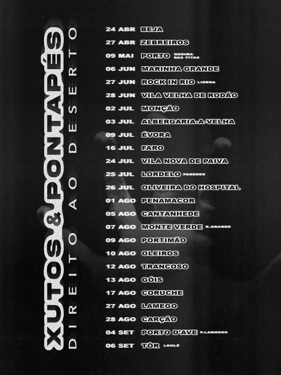 Os Xutos & Pontapés, que em janeiro completaram 47 anos de estrada, iniciam esta sexta-feira, em Beja, uma nova digressão, batizada com o nome do álbum que editaram em 1993, “Direito ao Deserto”. Numa publicação partilhada nas contas oficiais da banda nas redes sociais, lê-se que “a nova ‘tour’ dos Xutos & Pontapés arranca: Mais crua. Mais direta. Mais perto”. Amanhã, 24 de Abril, inauguram a digressão e celebram os 52 anos do 25 de Abril, no palco do Estádio Municipal Dr. Flávio dos Santos.
