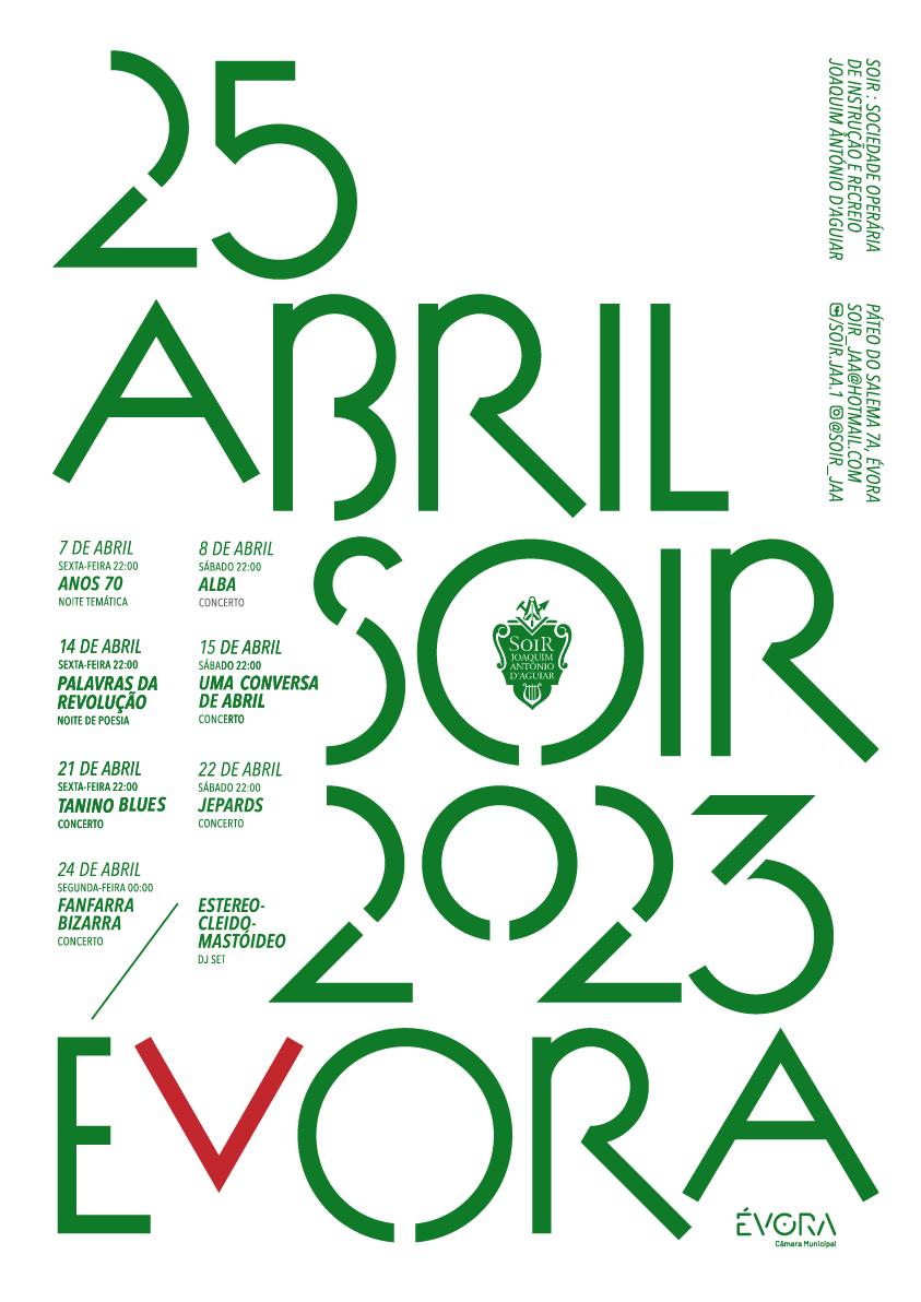 Em Évora as actividades são muitas e grande parte passa pela SOIR, a Sociedade Operária de Instrução e Recreio Joaquim António D'Aguiar, onde acontecem vários concertos.