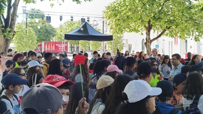 Os alunos da Escola de Santiago Maior saíram hoje, dia 24 de abril, à rua para celebrar 50 anos de liberdade e de saúde, percorrendo diversas ruas de Beja, para cantar "Grândola Vila Morena e distribuir cravos.