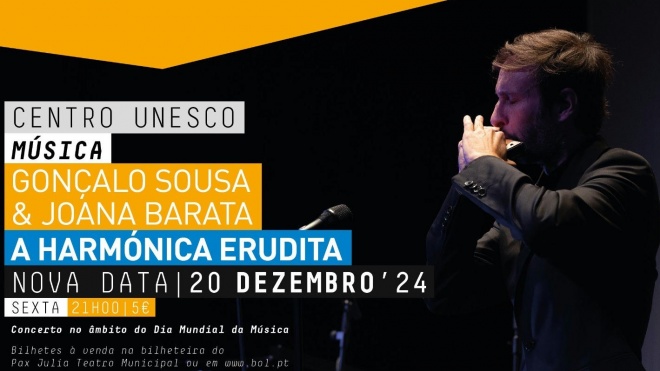 Nesta sexta-feira, dia 11, o concerto começa, no auditório do Centro Unesco de Beja, às 21h00 e junta em palco os músicos Gonçalo Sousa e Joana Figueiredo Barata para apresentarem "A Harmónica Erudita". Uma proposta que visa, também, a celebração do Dia Mundial da Música, assinalado no passado dia 1.